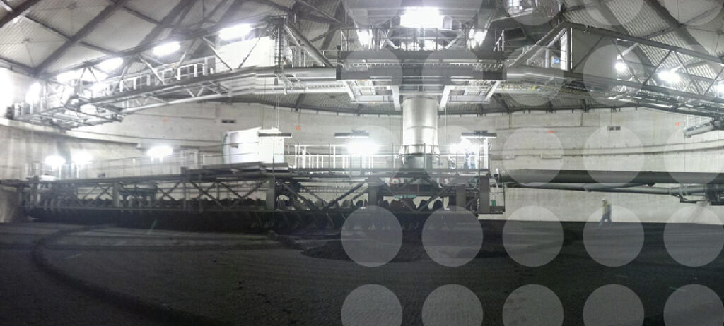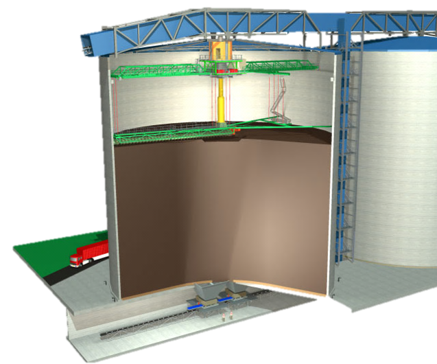 Conventional open-air storage requires sufficient space at your plant site and leads to costly environmental drawbacks and loss of calorific value. Enclosed storage in a highly automated Eurosilo solves all these problems at the smallest possible footprint. The system offers the safest storage in the market for up to 200,000 m³. The coal is fed from the top into a chute through which it reaches an auger frame on the coal surface. Two parallel screw conveyors distribute the material over the entire area while the auger frame rotates. Reclaiming is done at the bottom of the silo, while the screw conveyors rotate in reverse to feed coal into the formed core flow.
