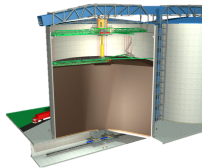 Conventional open stockpile storage requires valuable space, involving environmental drawbacks and loss of calorific value. Enclosed silo storage solves these problems at the smallest possible footprint. The Eurosilo system offers safe storage up to 100,000 m³ per unit. The material is fed from the top into a chute through which it reaches an auger frame on the coal surface. Screw conveyors distribute the material evenly while the auger frame rotates. The stored material is discharged at the bottom, while the screw conveyors rotate in reverse to feed coal into the formed core flow.